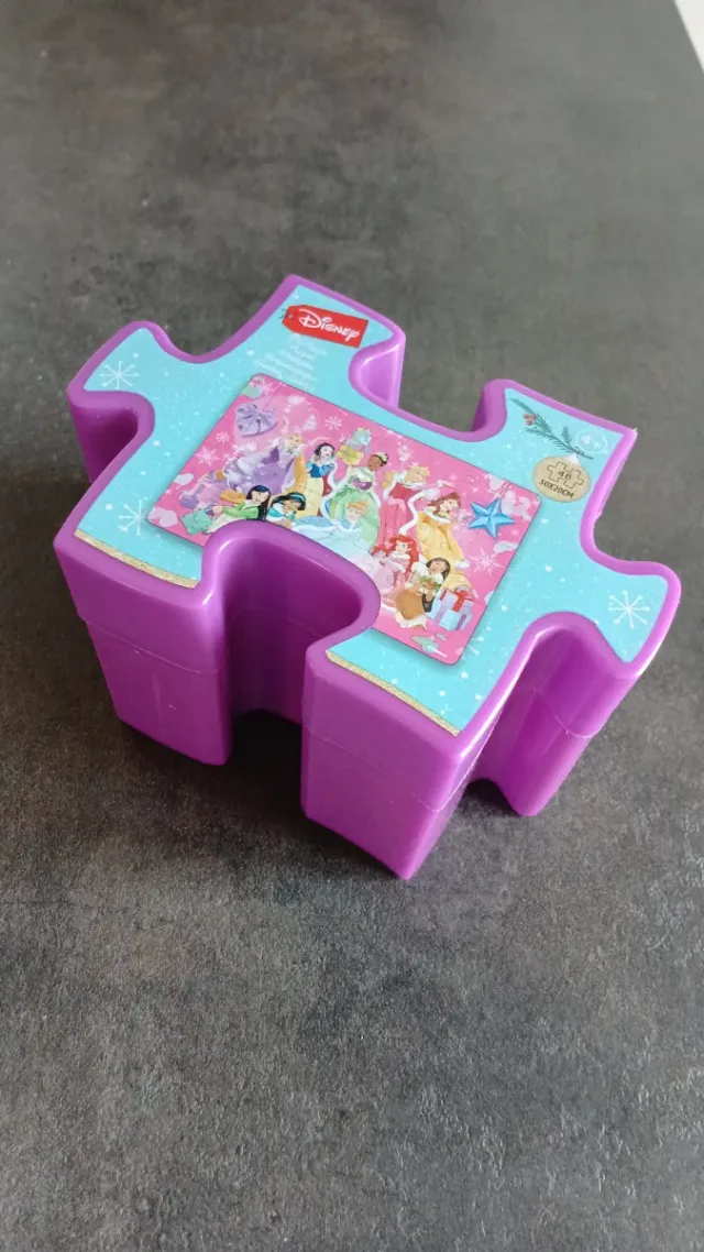 Puzzle a tema Principesse Disney, contenuto in una scatola a forma di pezzo di puzzle.