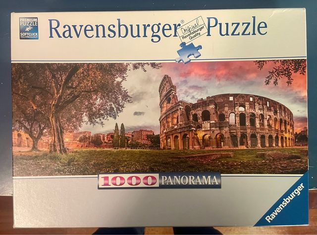 Dettagli del prodottoPuzzle panoramico Ravensburger da 1000 pezzi con una bellissima immagine del Colosseo a Roma.