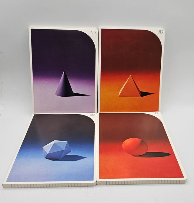 Dettagli del prodottoSet di quattro quaderni vintage con copertine illustrate da forme geometriche in 3D.