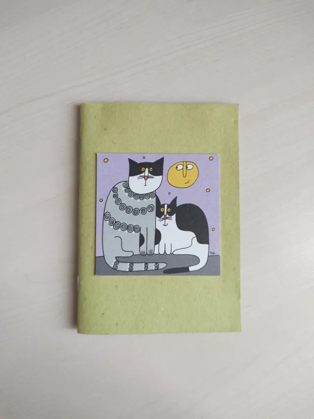 Dettagli del prodottoQuadernino taccuino con copertina color verde chiaro e un'illustrazione di due simpatici gatti (bianco, nero, grigio) stilizzati su sfondo viola con sole/luna sorridente. Marchio italiano Arbos in carta 100% riciclata. Sono state usate alcune pagine accuratamente strappate. Totale pagine (facciate) 28.