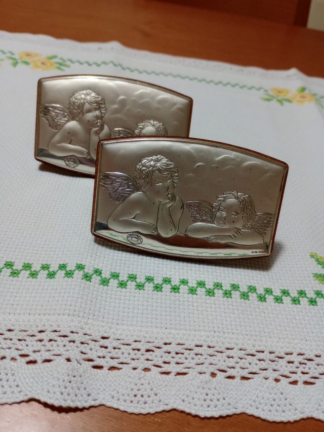 Coppia quadretti da appoggio.Raffiguranti angeli ,bagno argento e legno .Cm 9x6