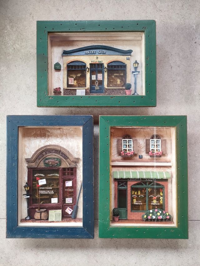 Dettagli del prodottoQuadretti con scene in 3D di vetrine e negozi, in resina, finemente particolareggiati; cornice in legno. misure 23,5x32. prezzo 20€ cad. Misure del prodotto