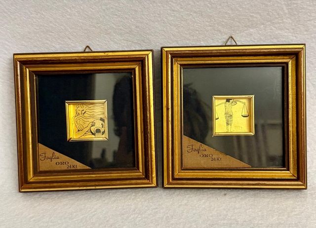 Coppia di quadretti con foglia d'oro 24 carati. - Cornice dorata. - Sfondo nero. - Raffigurazioni artistiche in oro.