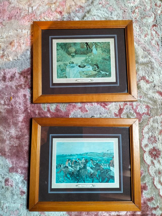 Due quadretti con riproduzioni artistiche di opere di Monet e di Degas. Le cornici sono in legno.