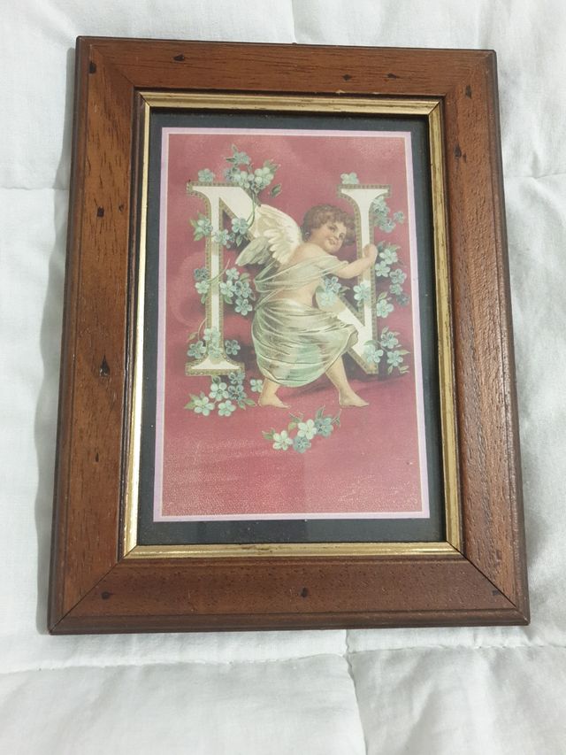 in legno e vetro integro raffigurante lettera N con angioletto lunghezza cm 21 larghezza cm 15,5