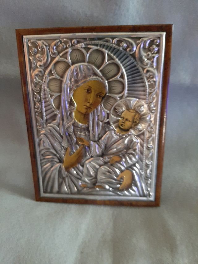 base in legno su cui è applicata lamina argentata con particolari dipinti su lamina dorata dimensione 13x10cm