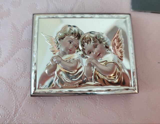 Quadretto d'argento raffigurante due angioletti, può essere appeso o su piano. Nuovo, con scatola originale e sua busta