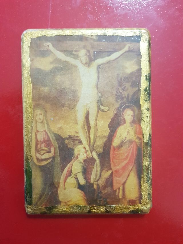 Dettagli del prodottoQuadretto in ceramica con decoupage crocifissione e cornice in foglia d'oro, in parte ossidata.