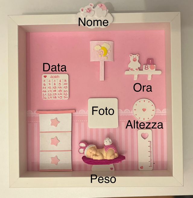 Quadro nascita personalizzato con i dati del bambino (nome, data, ora, peso, altezza).