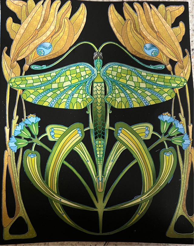 Dettagli del prodottoRealizzato a mano con tecnica scratch art, questo disegno raffigura una libellula su fondo nero con dettagli floreali, ispirata allo stile Art Nouveau/Liberty.