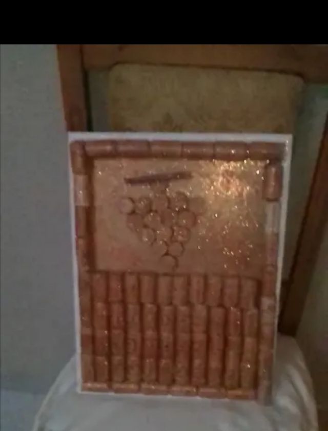 Quadro realizzato con dei tappi di sughero rappresentante un grappolo d'uva.
