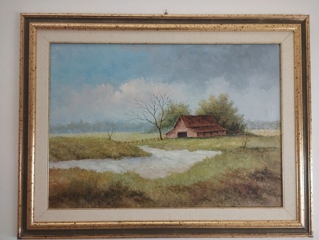 Dipinto a olio su tela 50*70 raffigurante un paesaggio rurale con un fienile rosso firmato Gene' Pompa Cornice dorata inclusa70*90