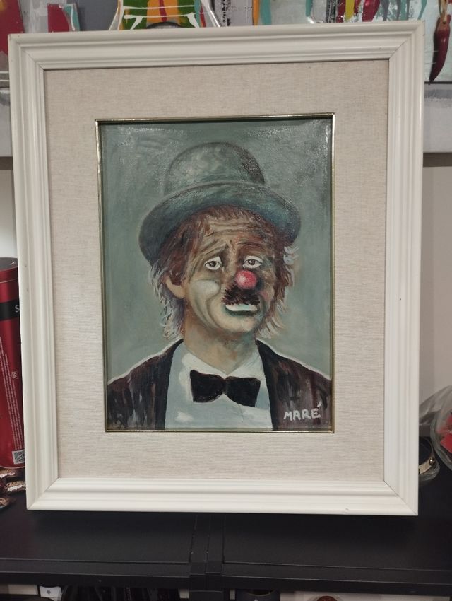 Dipinto a olio su tela 30*40 raffigurante un clown con cappello e papillon firmato Mare' Cornice bianca inclusa 50*60*4