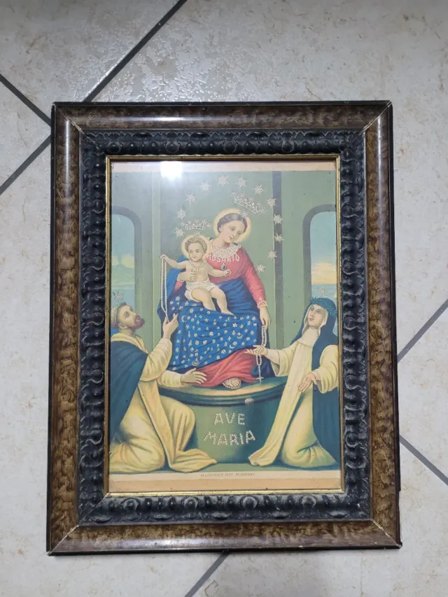 Dettagli del prodottoAntico quadro con stampa raffigurante la Madonna del rosario.