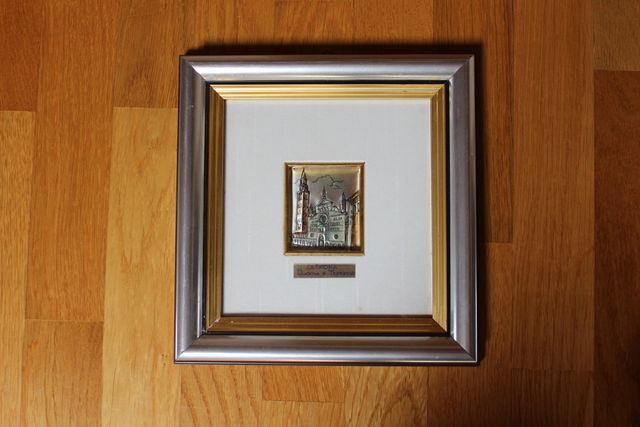 Dettagli del prodottovendo quadro argento 925% su lastra "Cremona Duomo e Torrazzo di Colizzi D. cesellato e rifinito a mano lastra cm 5.5 x 6.5 con cornice cm 22 x cm 23 Misure del prodotto