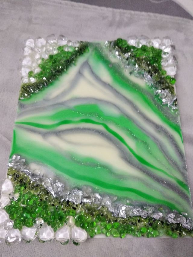 Dettagli del prodottoQuadro realizzato personalmente con resina epossidica, pietre decorative, scaglie di vetro colorate. Posizionabile su quattro lati a piacere. Pezzo unico. Misure del prodotto