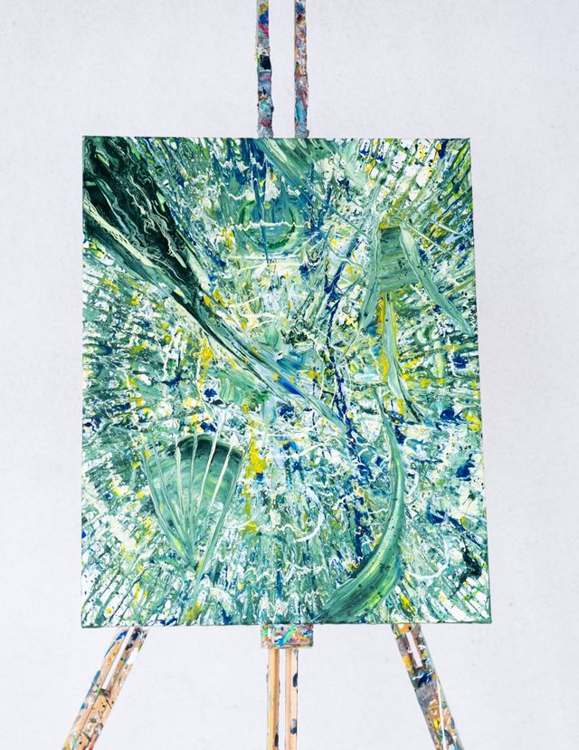 Questo dipinto astratto, immerso in una minacciosa tonalità di verde, funge da rappresentazione simbolica del veleno, che permea l'esistenza umana quotidiana. La tela danza con tratti frenetici, catturando le emozioni tumultuose e la sottile tossicità che aleggia sotto la superficie. L’uso di vivaci tonalità verdi evoca un senso di disagio, rispecchiando l’inevitabile presenza di questo veleno emotivo nelle nostre vite. L'artista fonde magistralmente vortici caotici e spigoli vivi, illustrando la complessità dell'esperienza umana intrappolata in questo elemento corrosivo.