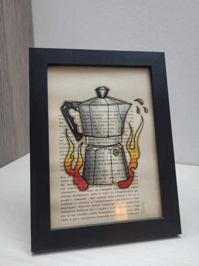 Dettagli del prodottoQuadro decorativo con disegno di una moka da caffè in stile traditional tattoo, realizzato su pagine di libro antico.