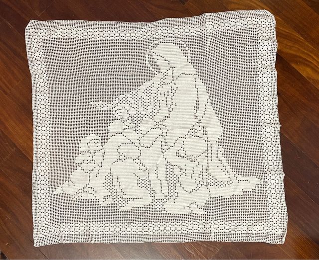 Vendo Quadro/Centrino Uncinetto Gesù, quadro/centrino lavorato a uncinetto con tecnica filet, rappresentante Gesù con dei bambini, misure 74x76 Nuovo