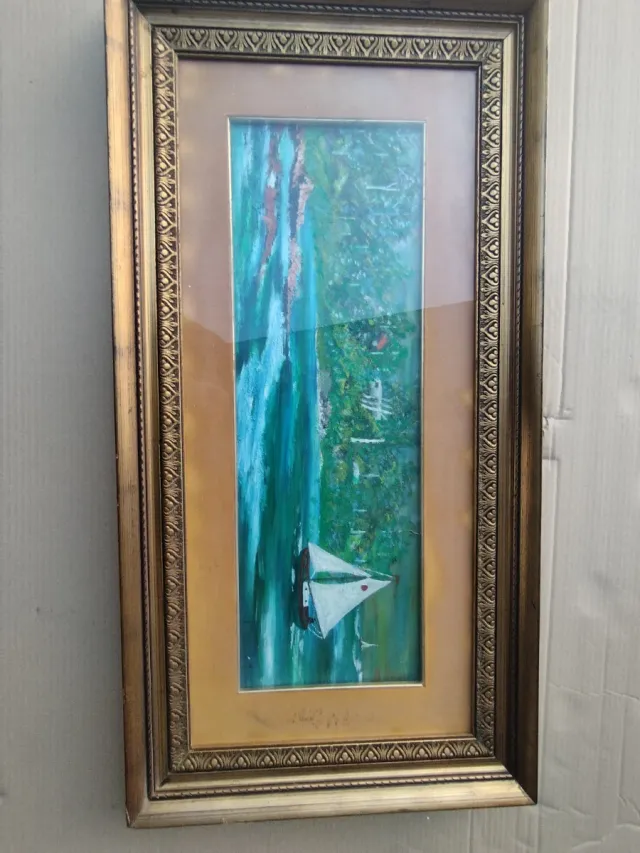 Dettagli del prodottoDipinto incorniciato raffigurante una scena naturale con una cascata e una barca a vela.