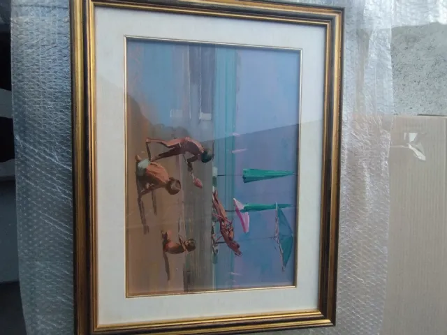Quadro incorniciato con una cornice dorata. L'opera raffigura una scena con figure umane e elementi colorati. - Cornice dorata. - Soggetto artistico.