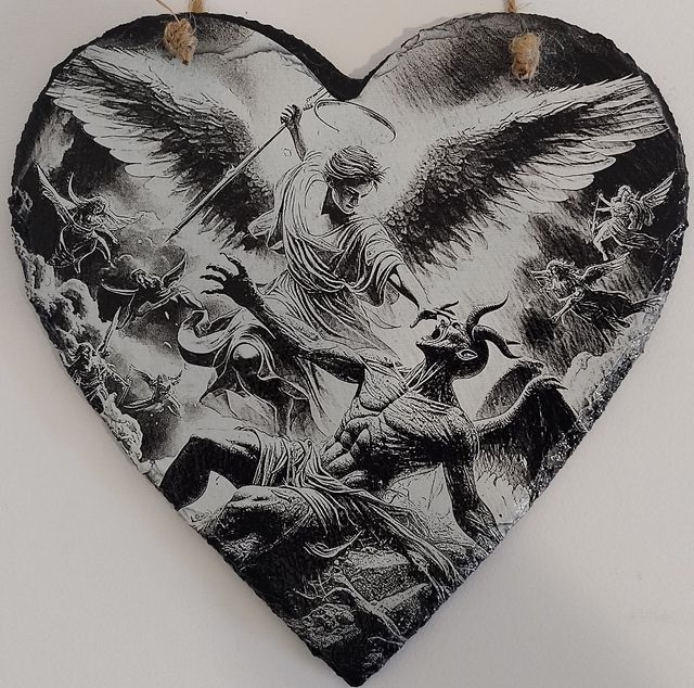 Dettagli del prodottoQuadro inciso su ardesia raffigurante Satana Contro un Angelo su forma di cuore da appendere. Misure del prodotto