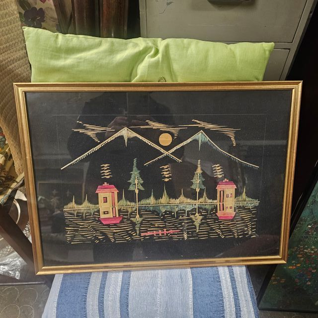 Dettagli del prodottoBellissimo quadro realizzato interamente con paglia, raffigurante un paesaggio montano con lago e casette.