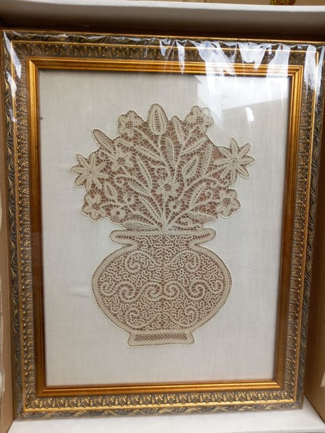 Quadro con cornice in ottone dorata ed interno in Cantù e Lino ricamato. non porta vetro davanti, cm 40x50. Nuovo in scatola