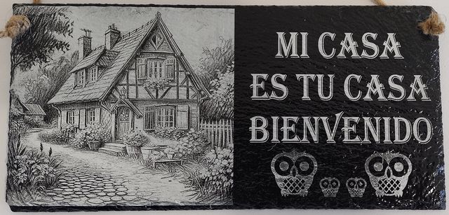 Dettagli del prodottoQuadro inciso in ardesia da appendere in casa con figura di una casa e frase di benvenuto Misure del prodotto