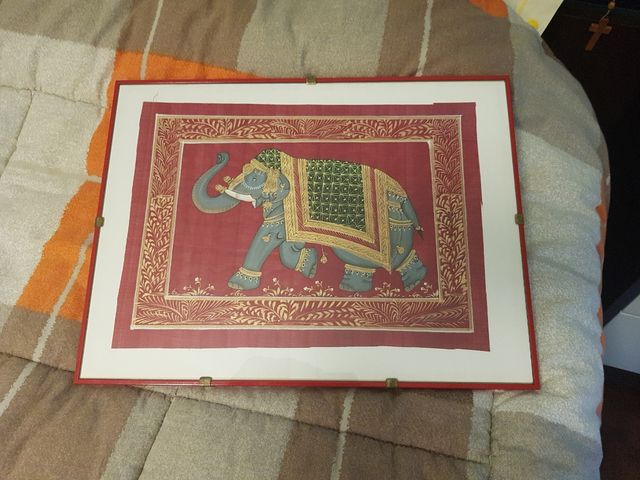 Dettagli del prodottoQuadro proveniente dall'India, su tela, incorniciato in cornice a giorno, 40x30 cm. Disponibile anche consegna a mano su Milano. Vendita anche della sola tela con elefante, senza cornice.