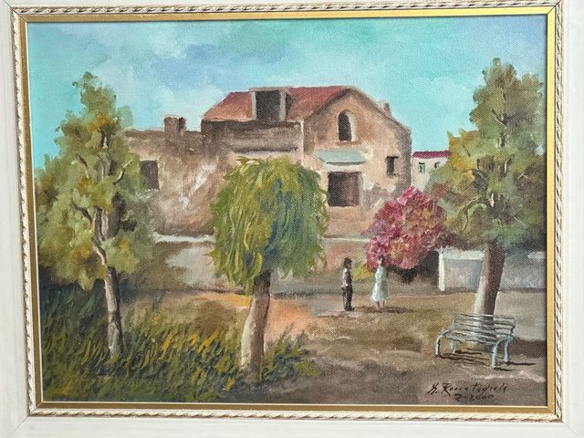Dettagli del prodottoDipinto ad olio su tela, misura 40x50 cm. L'opera raffigura un paesaggio con un edificio e figure umane. 50x60 completo di cornice