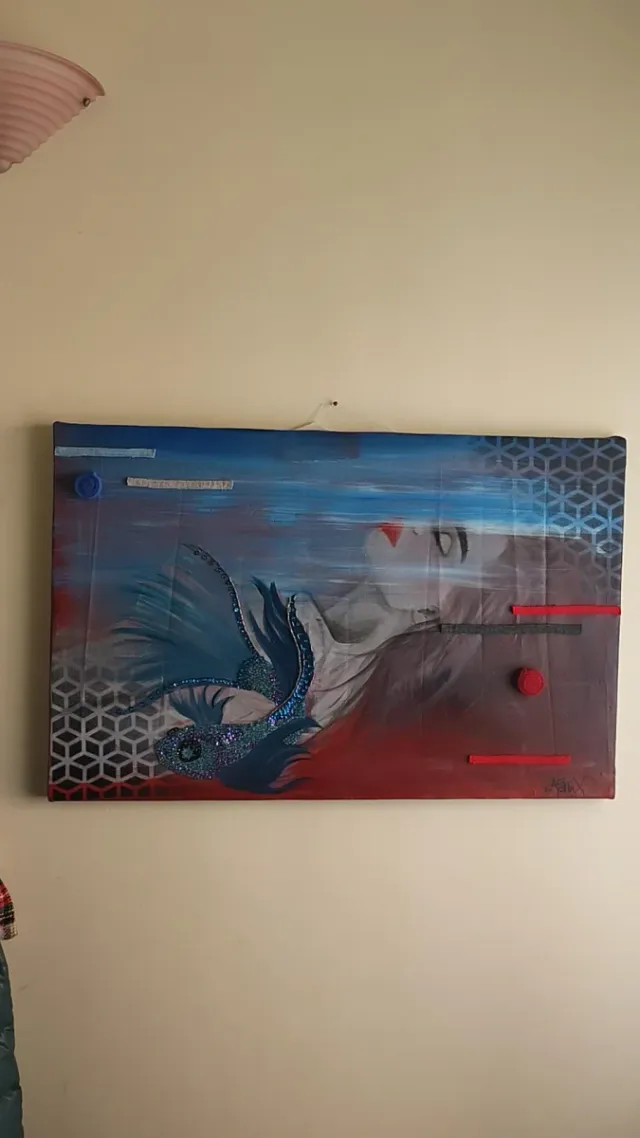 Opera d'arte unica realizzata con tecnica mista. - Pittura ad olio su tela. - Applicazioni di perline scintillanti. - Dettagli ricamati a mano.