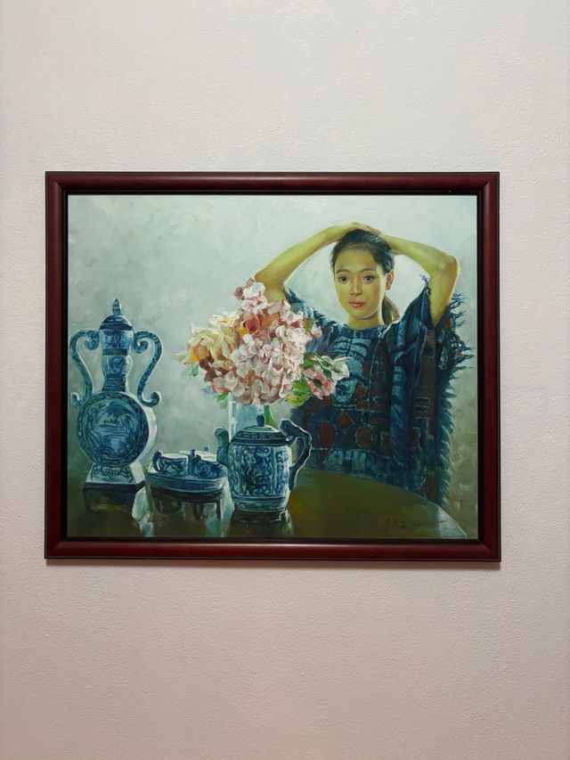 Raffinato dipinto a olio su tela di scuola cinese contemporanea, firmato in basso a destra in caratteri orientali. L’opera, risalente alla seconda metà del Novecento, raffigura una figura femminile con elementi di porcellana e motivi floreali, in uno stile che unisce tradizione orientale e tecnica pittorica occidentale.
