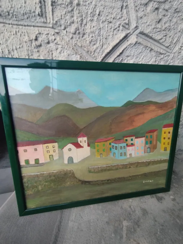 Dipinto raffigurante un paesaggio con un borgo e montagne sullo sfondo. - Colori vivaci. - Cornice verde. - Firma dell'artista in basso a destra.