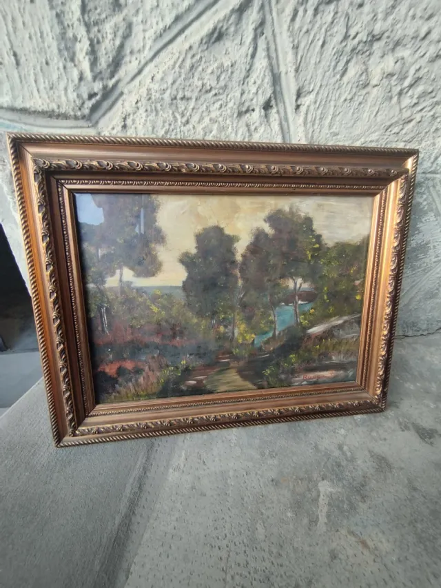 Dettagli del prodottoDipinto a olio raffigurante un paesaggio naturale con alberi e un corso d'acqua. La cornice è in stile dorato e decorato.