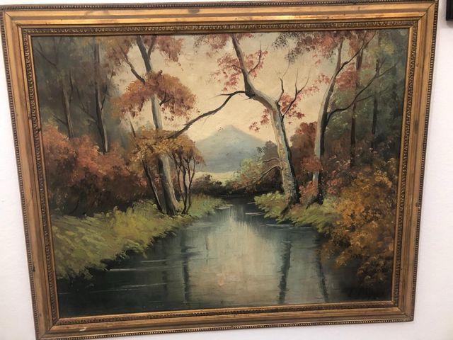 Dipinto ad olio raffigurante un paesaggio fluviale in autunno. - Alberi con foglie dai toni caldi. - Riflessi sull'acqua. - Montagna sullo sfondo. misura 58-48 cm