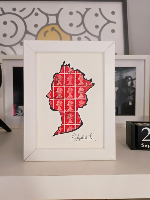 Dettagli del prodottoBellissimo quadro raffigurante il profilo di Sua Maestà la Regina Elisabetta II, intagliato su carta di lino con transita telata, realizzato con veri francobolli inglesi che la raffigurano nella medesima posa.