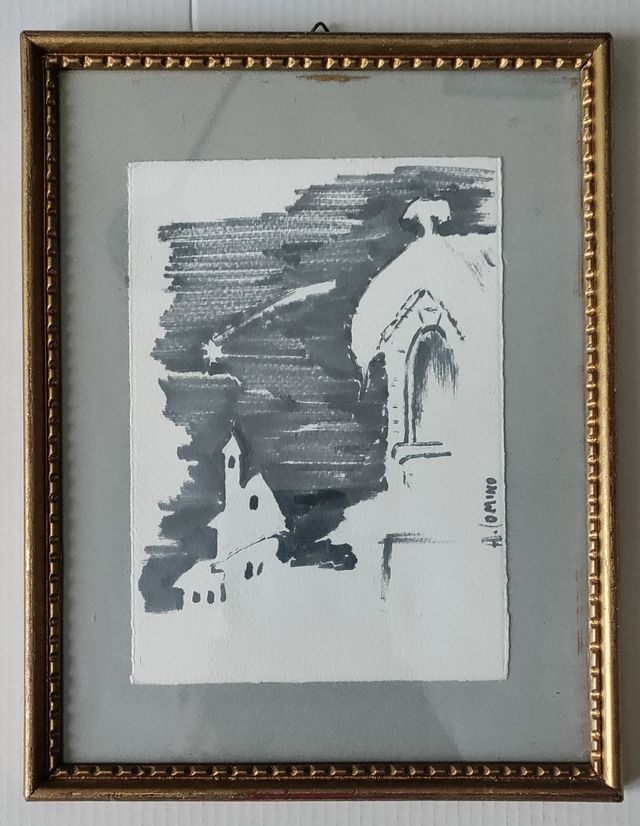 quadretto cm. 19 x 24 cornice dorata passepartout grigio disegno a pennello di A.Comino Mondovì (CN) soggetto natalizio (ex biglietto auguri festività 1969)