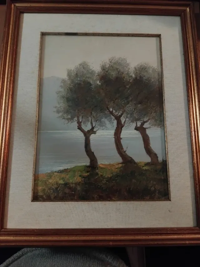 Dettagli del prodottoDipinto vintage raffigurante un paesaggio con alberi e lago. L'opera è incorniciata, dimensioni 46x56 cm.