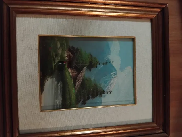 Dettagli del prodottoDipinto vintage raffigurante un paesaggio montano con lago e montagne innevate dimensioni 34x40 cm.