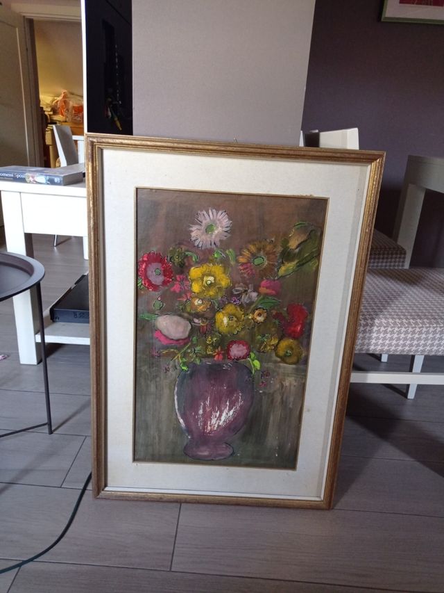 Dettagli del prodottoquadro vintage dipinto a mano con vaso di fiori con vetro e cornice in legno Misure del prodotto