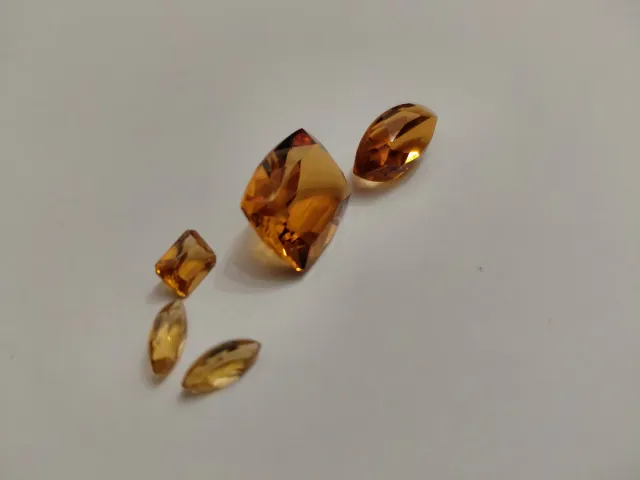 Lotto di quarzo citrino grezzo. - Peso totale: 30 carati. - Colore: giallo dorato intenso. - Taglio: misto, con diverse forme presenti.