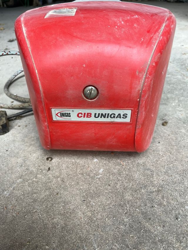 Bruciatore per caldaia a gasolio della marca Unigas. Colore rosso.