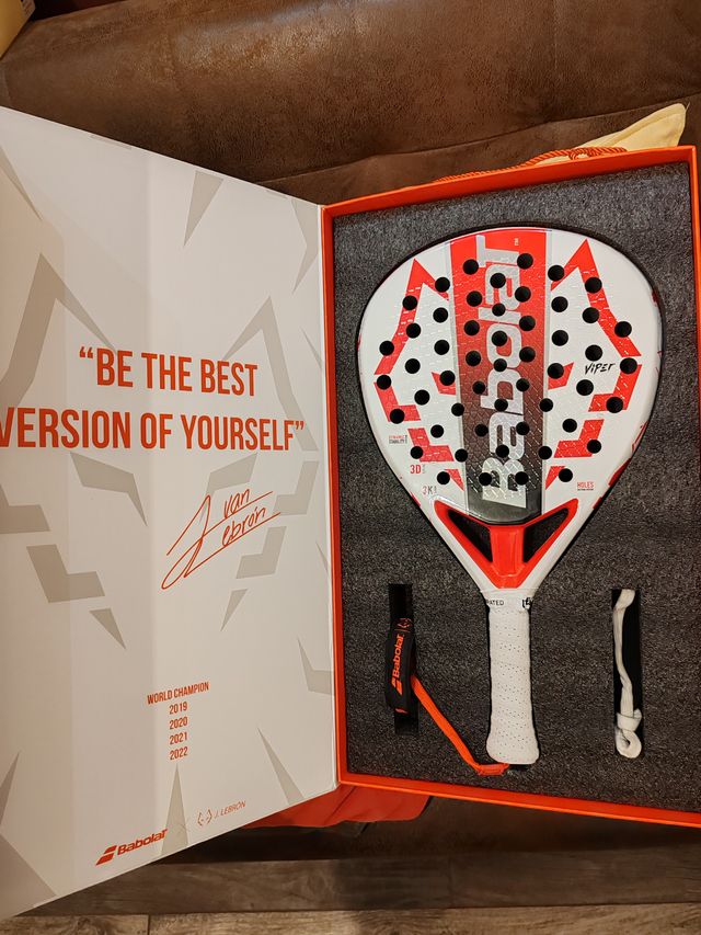 Dettagli del prodottoRacchetta da padel Babolat Viper Lebron 2.5 peso 367 senza copritesta unico segno visibile quello nell'ultima foto, installato copritesta bump da 2,8 gr peso