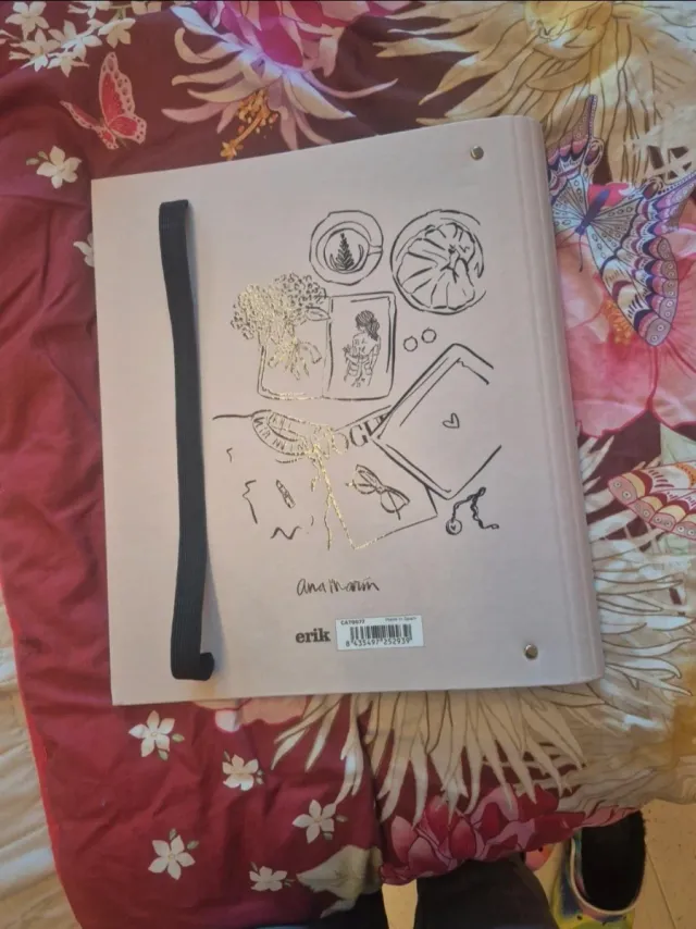 Raccoglitore del marchio Erik con un design illustrato. - Illustrazioni in stile schizzo. - Dettagli dorati. - Elastico di chiusura nero.