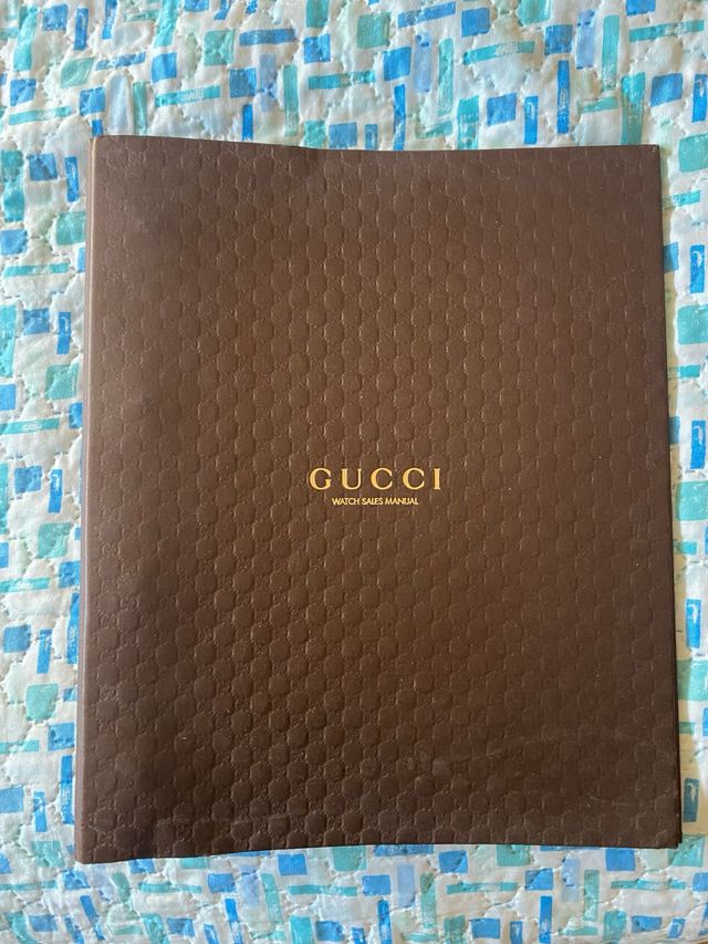 Raccoglitore Watch Sales Manual di Gucci. - Copertina marrone con texture. - Logo Gucci dorato in rilievo.