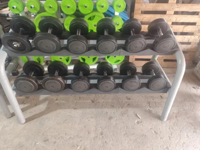 Dettagli del prodottoRack da palestra con manubri Technogym. Struttura robusta per il deposito di pesi. Include vari manubri di diversi pesi. La descrizione è stata tradotta automaticamente.