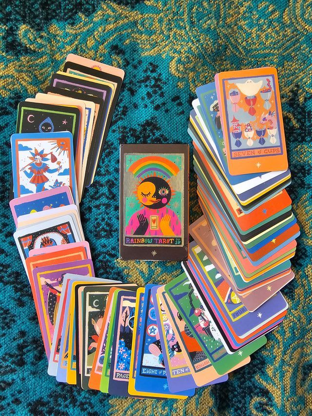Mazzo di 78 carte "Rainbow Tarot", nuovo e mai usato, in pratica scatolina. Carte vivaci e colorate, perfette per letture intuitive, collezione o come idea regalo originale.