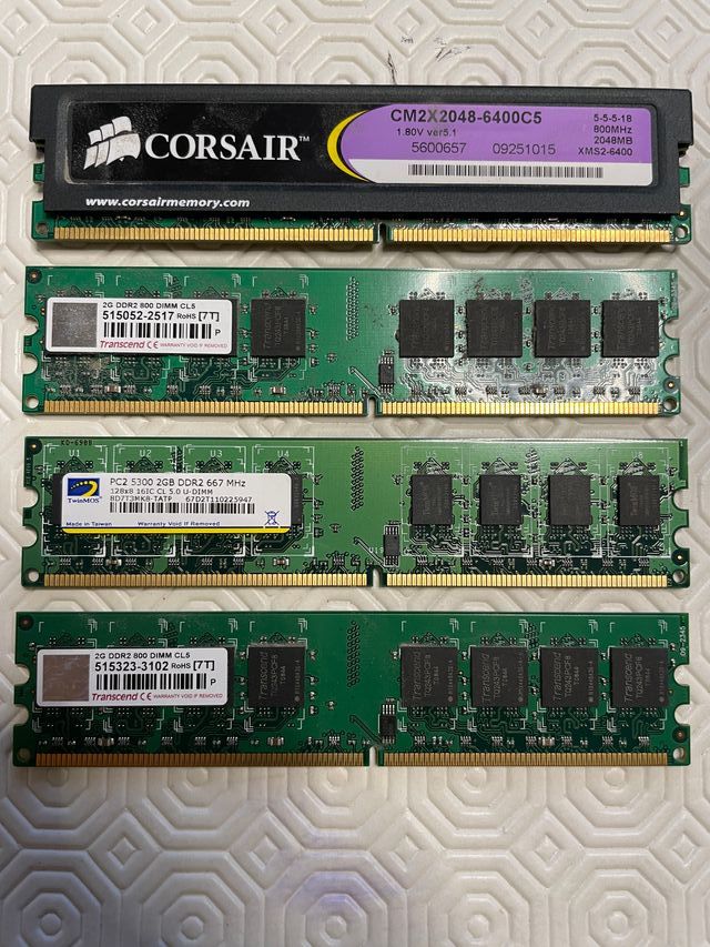 Dettagli del prodottoVendo 4 moduli di RAM Corsair da 2GB DDR2 DIMM. Sono in buone condizioni, perfetti per un upgrade del tuo vecchio PC. Funzionanti, sono state usate sullo stesso PC e lavorano bene in 4 banchi per avere 8GB totali.