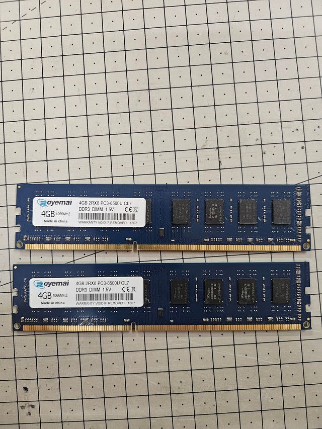Vendo due banchi di memoria RAM Royemai. Sono in ottime condizioni. - 2 moduli RAM da 4GB ciascuno. - DDR3 PC3-8500U. - CL7.